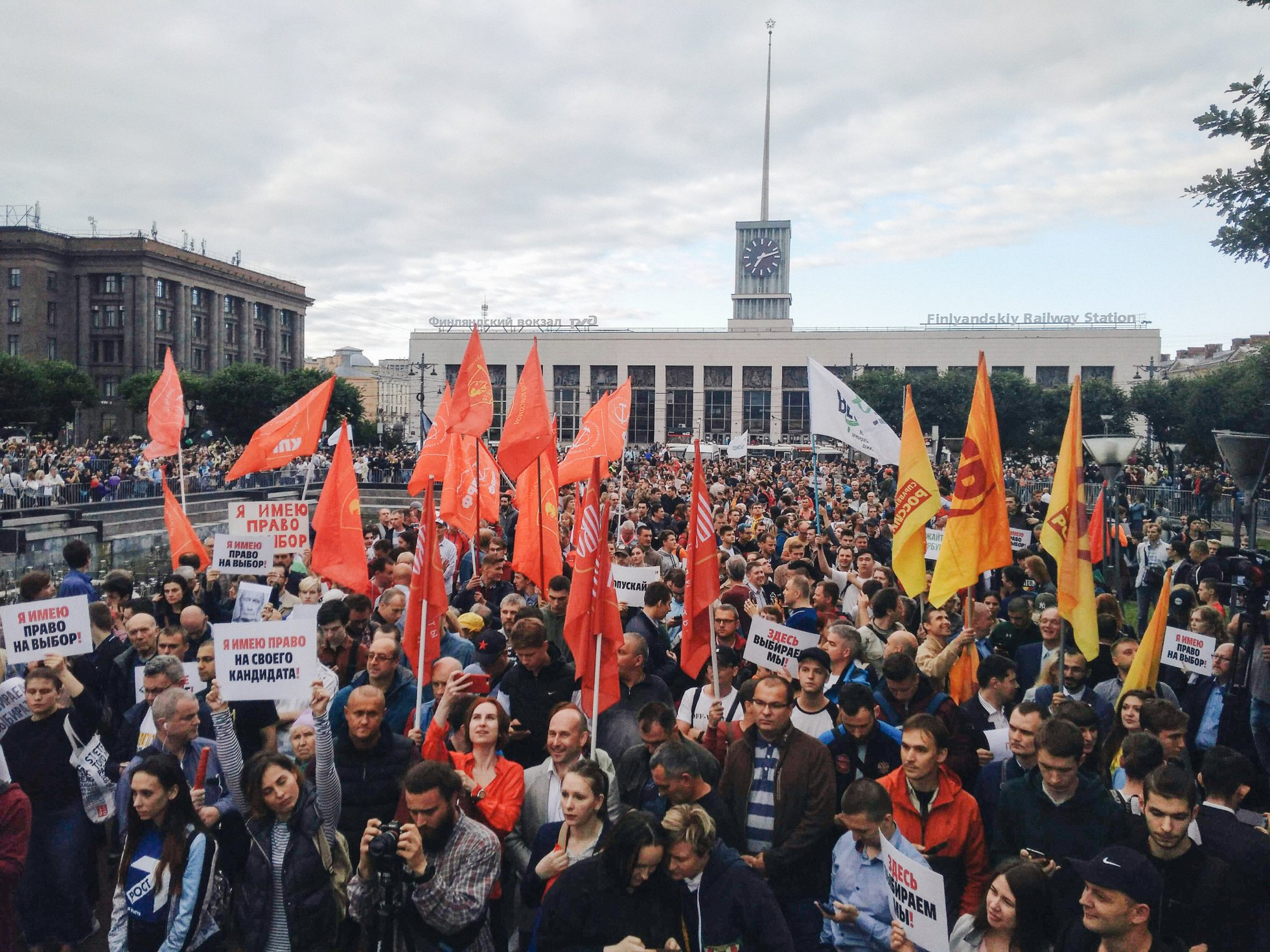В Санкт-Петербурге у Финляндского вокзала вечером 24 июля прошел митинг против нарушений на выборах — в сентябре в городе пройдут выборы губернатора и муниципальных депутатов; больше сотни оппозиционных кандидатов не смогли зарегистрироваться. По оценке корреспондента «Медузы», на акцию пришли три-четыре тысячи человек, организаторы сообщили о шести тысячах собравшихся, полиция насчитала две тысячи человек. Акция прошла и завершилась без каких-либо инцидентов. Уже после митинга один из участников был задержан, вскоре его отпустили без составления протокола.