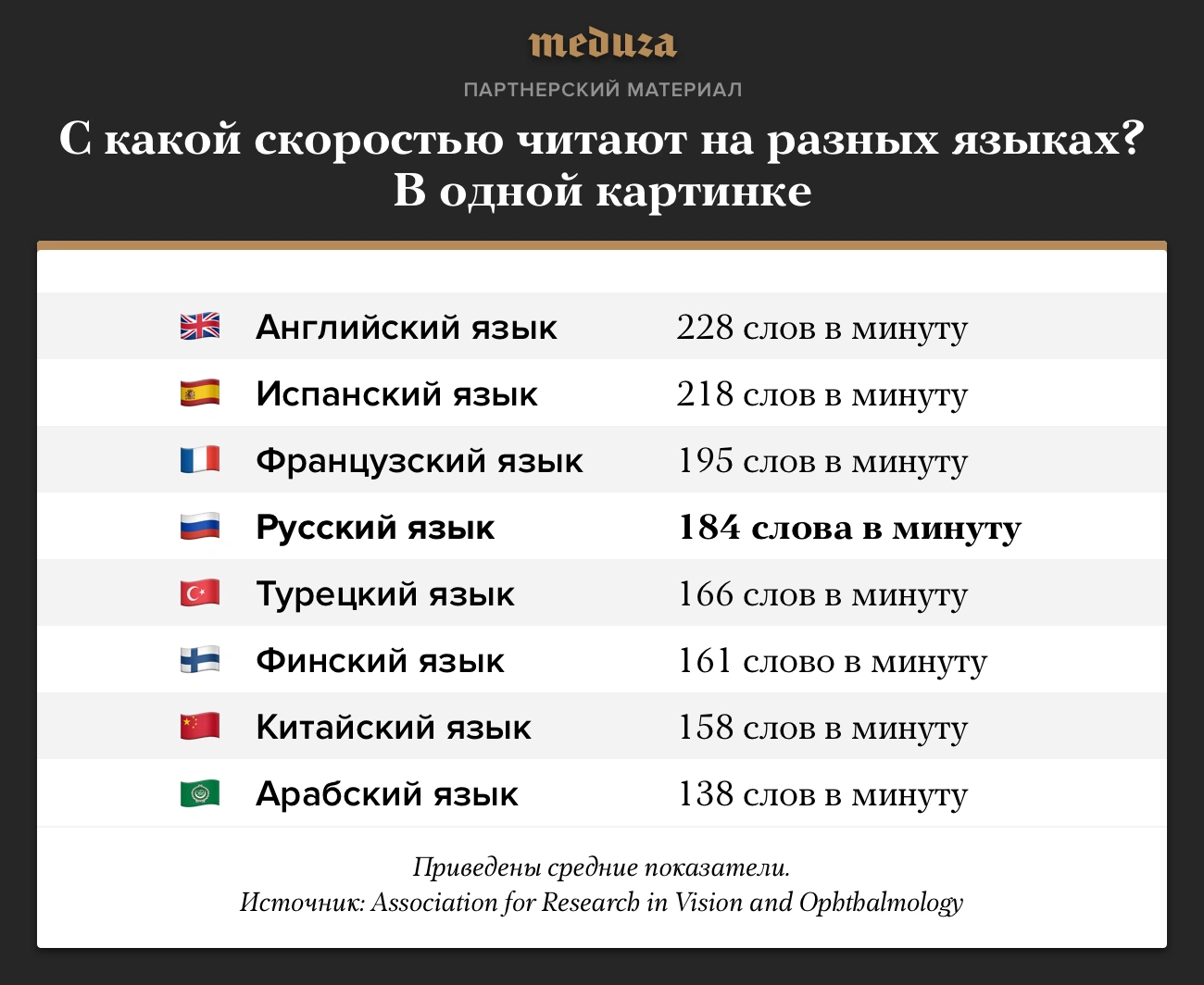 Определить свою скорость чтения на русском языке можно на онлайн-платформе «Викиум», где собраны десятки различных упражнений для мозга — на проверку скорости чтения, памяти, внимания, логики и другие.